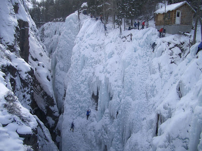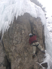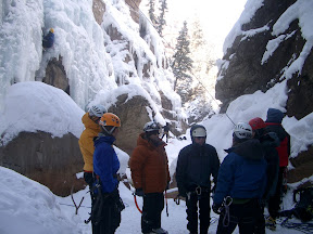 I signed up for a hard mixed clinic with Guy Lacelle. Ever since I saw him do the splits into a heel hook over his head in the 2006 Competition, I had wanted to take a clinic from him. And what a bonus, Audrey Gariepy (second overall in 2007 and first in the women’s) came along for the clinic. To their credit, they were both great instructors and just nice people. Here they are (Audrey second from left and Guy third from right) with the other clinic participants. We had fun on TicTac and SuperDave.
