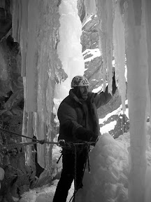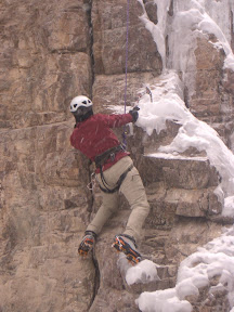 A group of 12 climbers from the Tacoma Mountaineers headed to Ouray in January 2007 to get in some ice climbing and watch the annual Ouray Ice Festival. The Uncompaghre Gorge is a pretty spectacular place to be when the ice is in. And it’s pretty much always in during the winter months, thanks to a permanent irrigation system that makes ice whenever the sprinklers are turned on. Here’s Rex about half way up the classic WI4 line, Pick of the Vic: