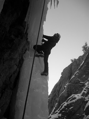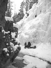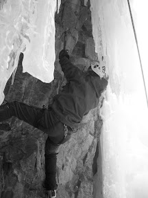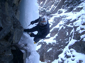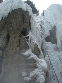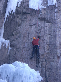 The brittle ice drove us into the mixed route in the School Room by the pillar, which was being climbed by some people who did not understand that you do not whack the heck out of a free-standing pillar, particularly on cold brittle days, and particularly when it makes that really nauseous THUNK noise. I’m sure they got some RAD photos to show the guys back home! If they lived that long….