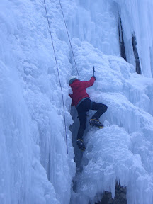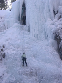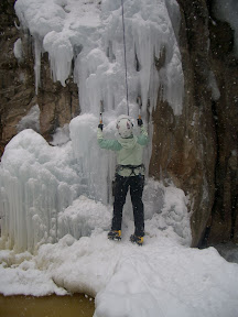 This was Julie’s first visit, and after getting over the shock of “I’m going to climb THAT?!” she took to the ice like white on rice. Or ice. She liked her new Vipers and discovered the joys of leashless climbing when the rope wrapped around her tool.