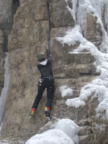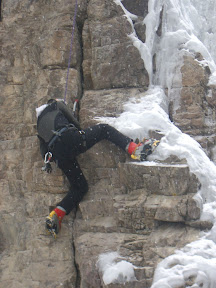 We had a blast on Jesus Built My Finger Crack (M7) in the Mixed Alcove. The climbs always look intimidating from the base! The ice part is no sweat, but then the fun begins. Getting that first good torque in the crack is reassuring, then the focus turns to your feet. The trick is to move reasonably quickly and avoid over-pumping, not so easy to do with my ancient clodhopper boots. I was glad to have my monopoint crampons but missed the lightweight comp boots I had demo’ed the day before.