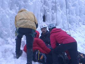 Since we were just about to leave, Jim had walked around to the top rope anchors to start tearing stuff down. He didn’t know what had happened, but after a few yells back and forth, a passerby had called Ouray Mountain Rescue (I guess he had Mark Miller on speed dial) and Jim stood by making sure no one set up over the top of the group.